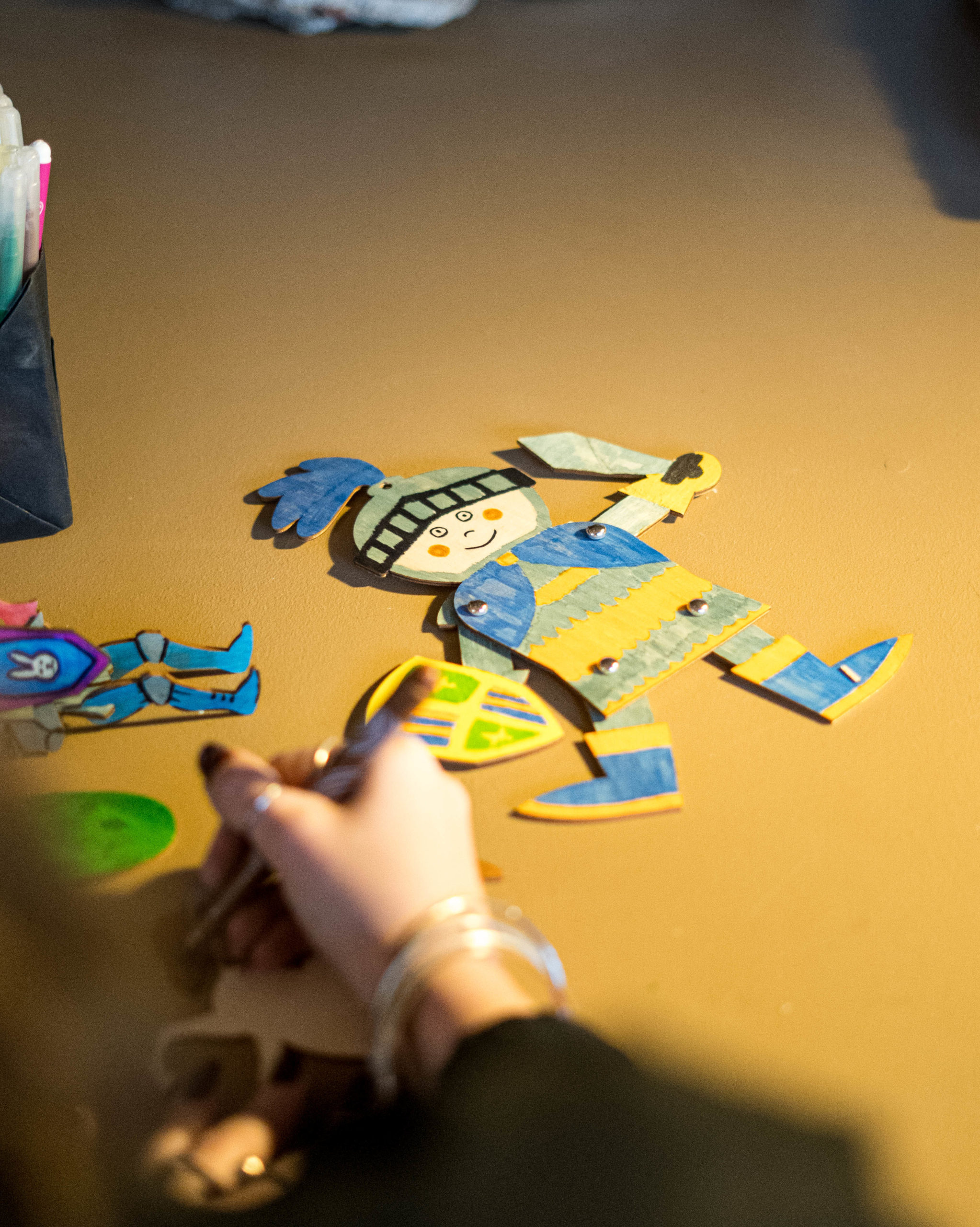 Place à la création ! Les enfants assemblent et personnalisent leur propre chevalier articulé en bois. Du blason au casque, chaque détail est unique.